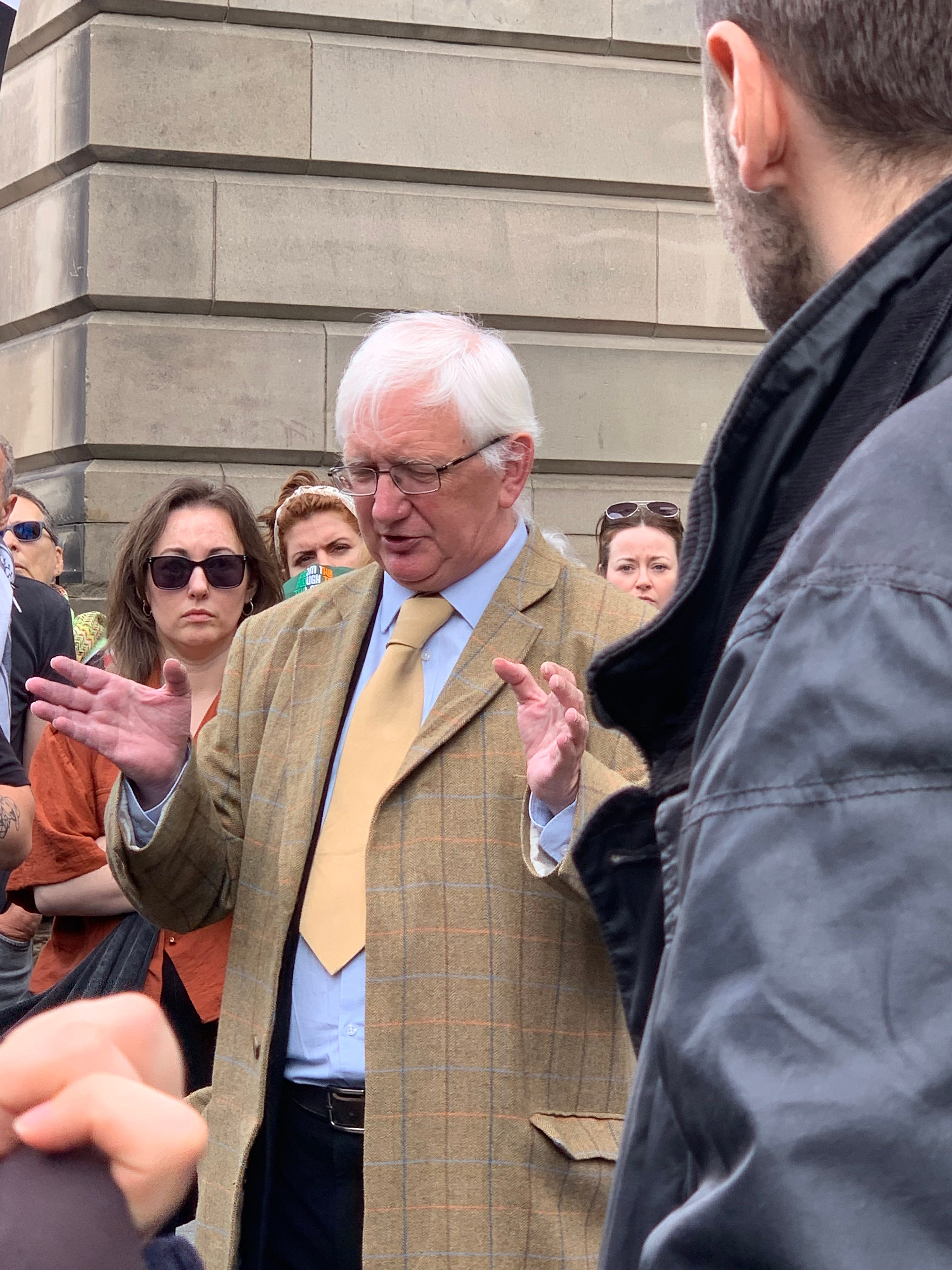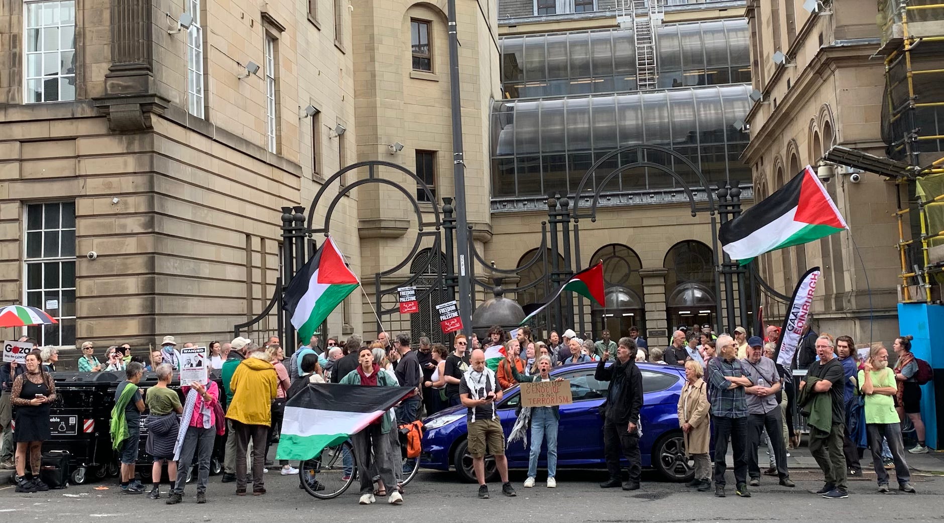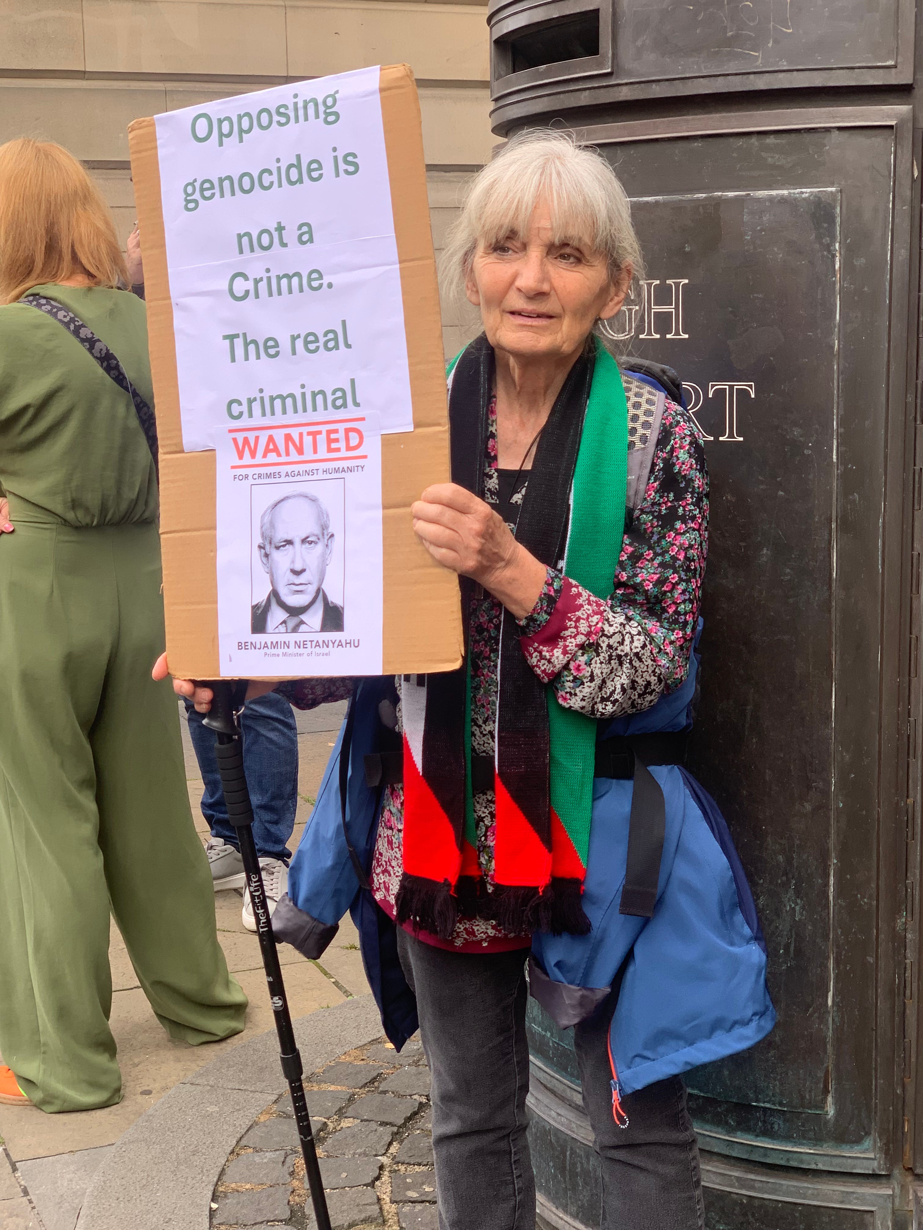 Mick Napier, portavoce della Scottish Palestine Solidarity Campaign (SPSC), ha tenuto la folla informata come meglio poteva. Ha raccontato di essere stato incriminato dalla polizia per aver semplicemente detto "fine dell'assedio di Gaza". Ha paragonato quanto sta accadendo alle ingiustizie del passato, citando la violenza della polizia del South Yorkshire nella cokeria di Orgreave durante lo sciopero dei minatori del 1984. Thatcher definì i minatori "il nemico interno" , e senza dubbio è così che il regime di Stamer considera i cittadini britannici che protestano contro il genocidio. Il Guardian ha riportato oggi che Yvette Cooper, che aveva dichiarato Palestine Action un gruppo terroristico, ha annunciato, 40 anni dopo, un'inchiesta giudiziaria su Orgreave.