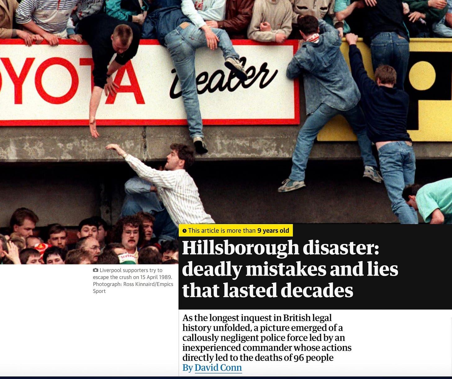 Si scopre che la polizia del South Yorkshire è stata responsabile anche della tragedia di Hillsboro . 96 persone sono state uccise illegalmente e la polizia ha mentito e cospirato per incolpare le vittime.